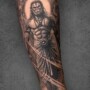 - Background Integration: The use of subtle smoke or clouds in the background adds depth and movement, making the mythological figure appear to transcend the skin.